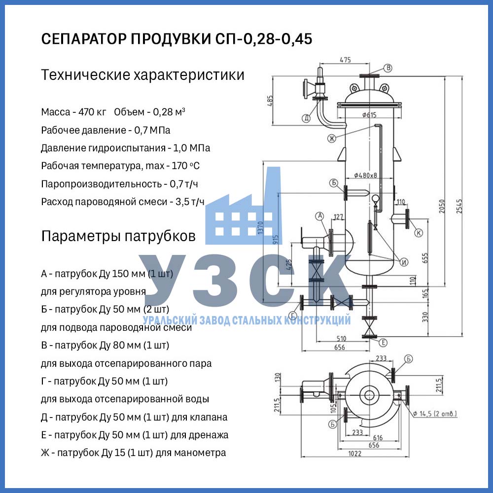 Компания «УЗСК» производит надежные сепараторы продувки типов СП и СНП, соответствующие требованиям ТР ТС 032/2013, для работы в составе систем теплоснабжения и технологических линий.